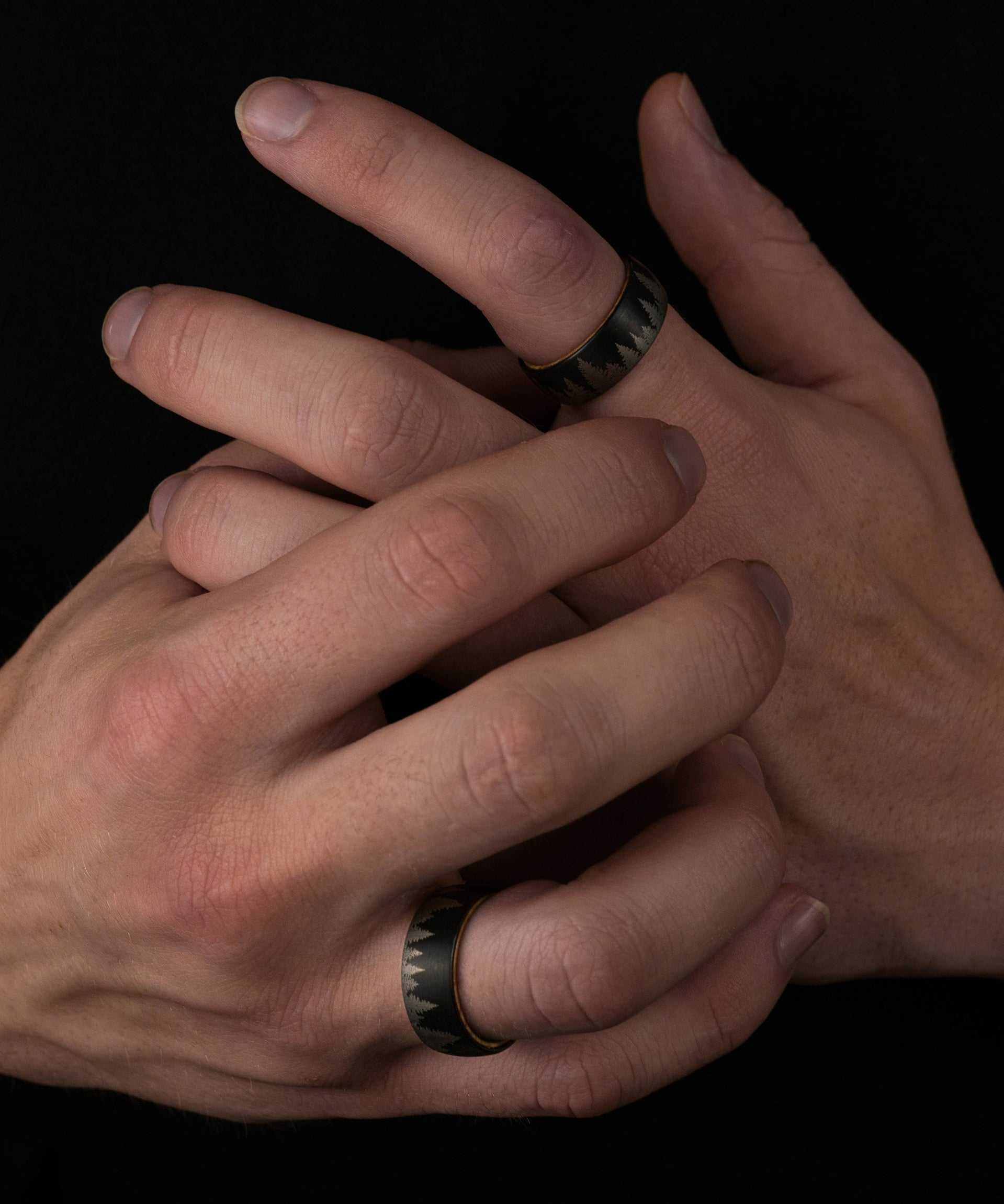 Gorgeous black satin finish low dome band style tungsten ring with beautiful forest scenery etched outer band and wooden inner band. Timeless yet modern.