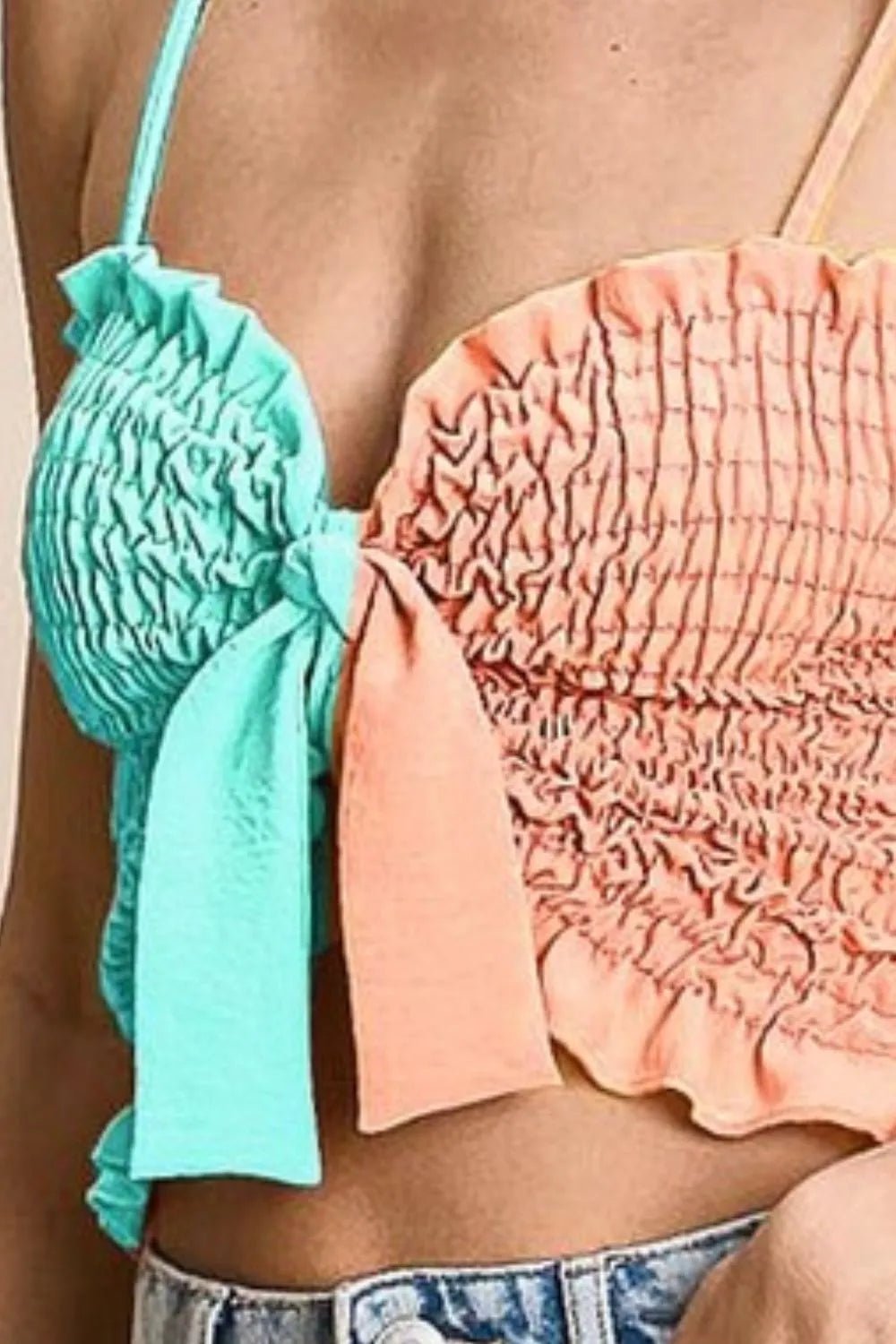 The Woven Color Block Smocked with Ribbon Bra Top is a stylish and trendy clothing item. It features a unique color block design combined with smocked detailing and ribbon accents for a fashionable look. This bra top is perfect for adding a fun and vibrant touch to your wardrobe.