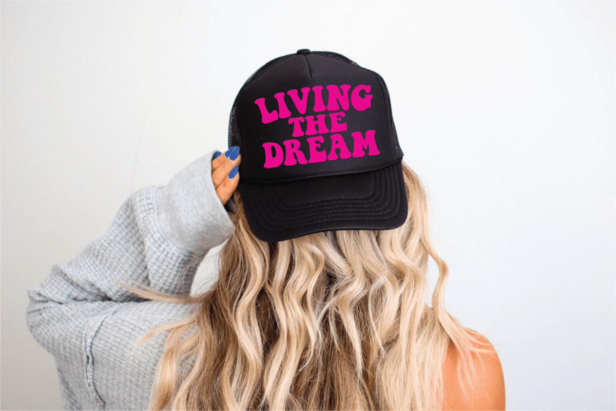 "Livin The Dream" design direct-to-film printed on a Black foam trucker hat. The perfect accessory to make a bold statement!