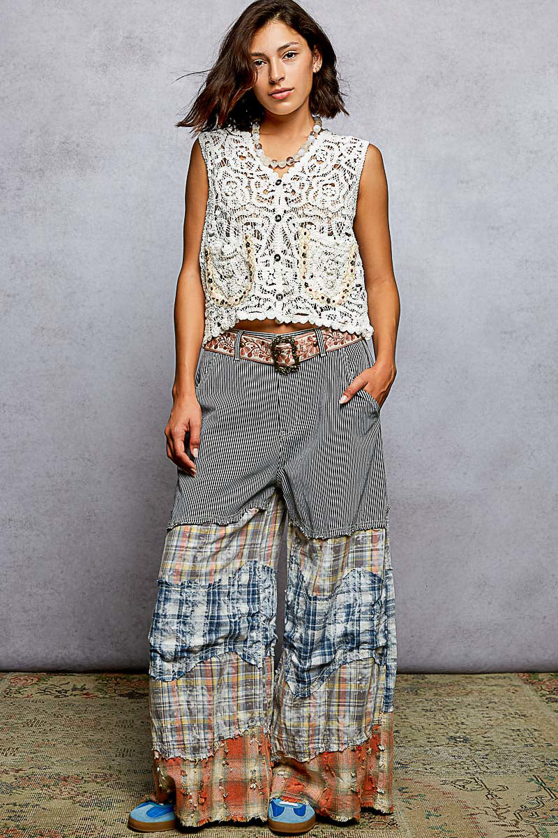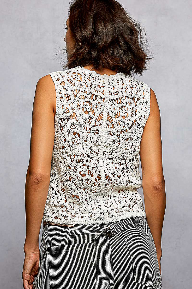 Designed in V-neck sleeveless relaxed fit top in crochet with varied patterns, stud and beads on pocket, dual patch pocket, scalloped edge and button closure.