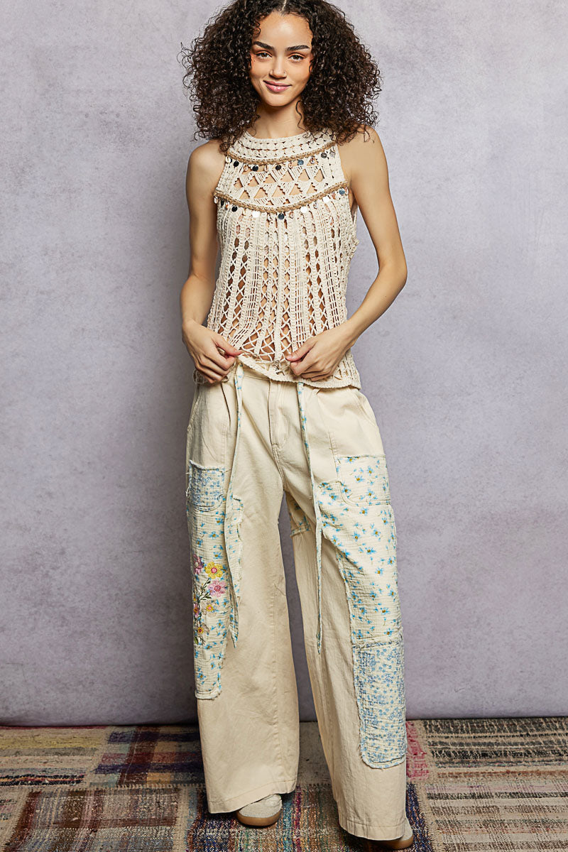 POL Halter Neck Sleeveless Crochet Top with Seashell & Mirror Dangle Trim