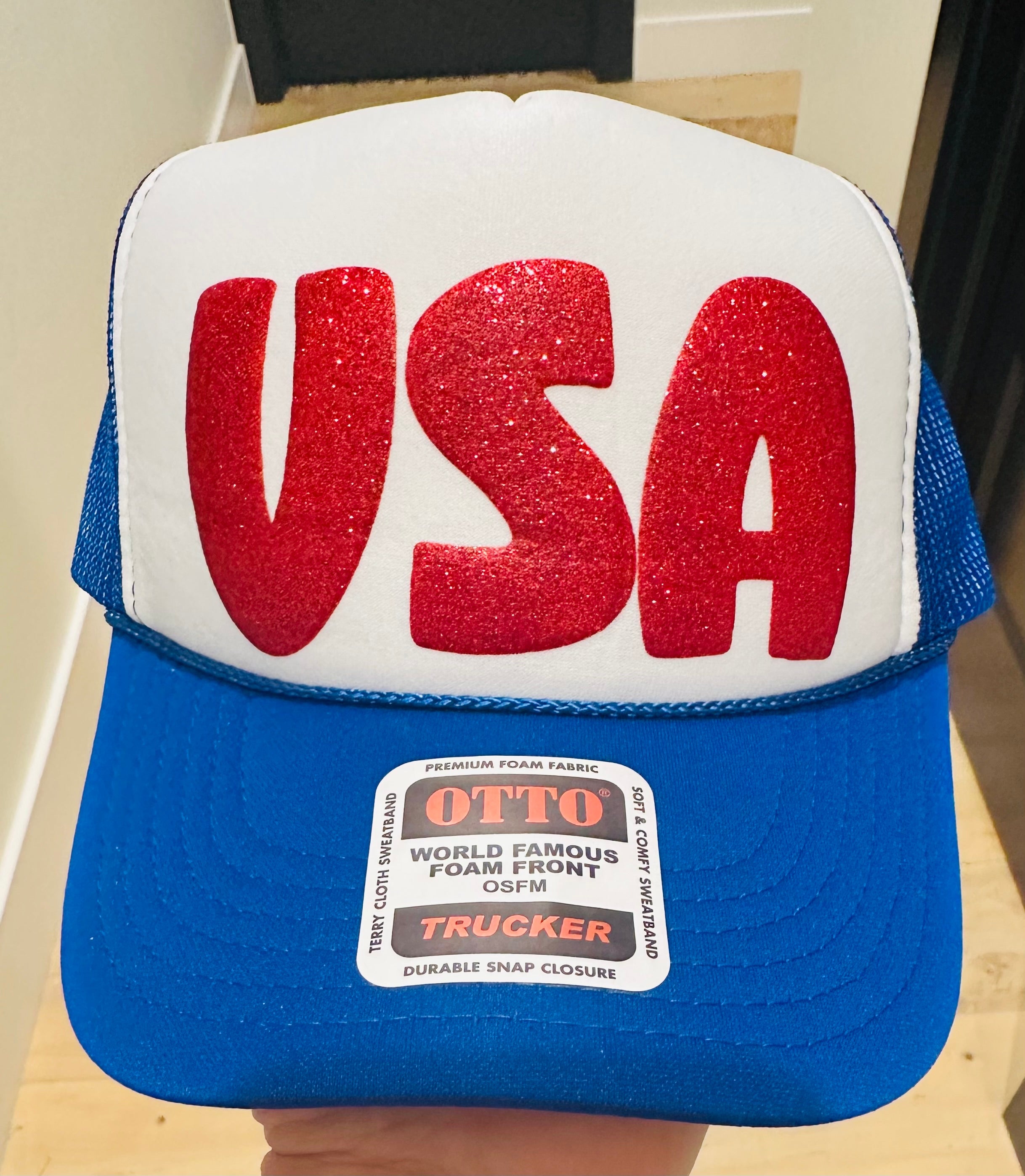 USA in Red Glitter Puff Vinyl on a Royal Blue and White foam trucker hat. The perfect accessory to make a bold statement!